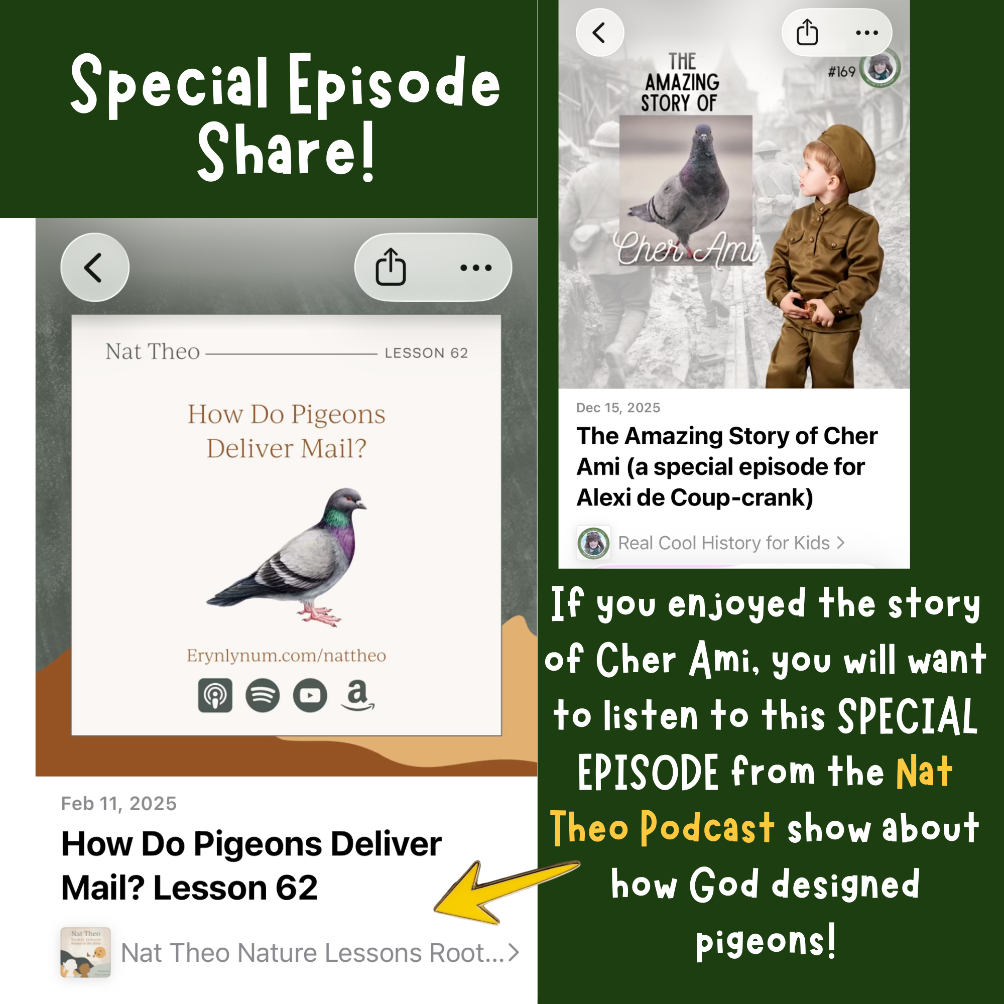 Have you ever heard of a bird delivering mail? We recently learned about Cher Ami, a homing pigeon who served in World War I and delivered a life-saving message that helped save many soldiers. Today, we are deep diving into how God designed homing pigeons with this incredible ability to find their way across the sky. This lesson comes straight from Nat Theo: Nature Lessons Rooted in the Bible, a podcast for kids and families.
